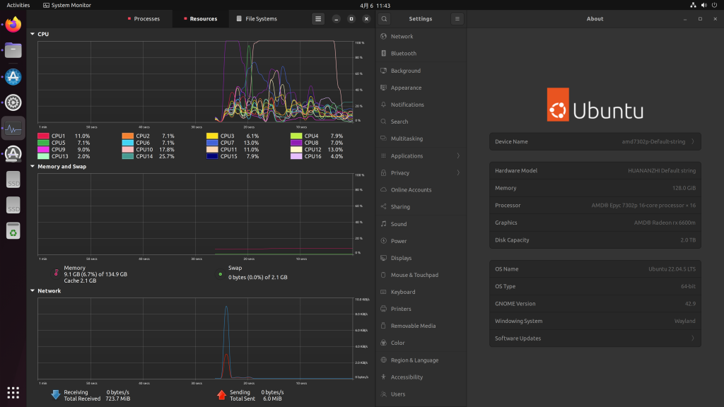 华南金牌这块主板刚一上市,就吸引了小编的注意,第一时间拿下,但因为工作太忙了,一直没有测评。这台测试机插满了 8 条 16G 3200MHz reg ecc 内存,2026年4月,市场价大约¥15,000,庆幸买得早。固态硬盘也给到了2T。显卡本来没有配,打算远程过去,但调试期间一直出状况,因而买了同为寨厂魔改的精粤 AMD RX 6600M 8G。正所谓“妖板配妖卡”。不知道华南和精粤的产品之间有没有兼容性测试?AMD 的服务器 CPU 和移动端 GPU 之间有没有神秘加成。
