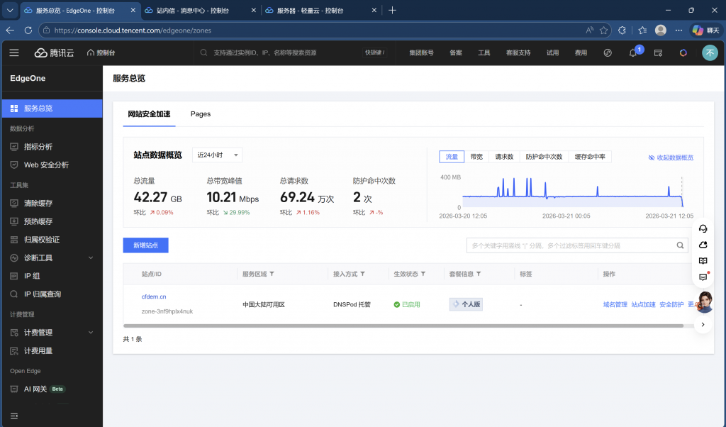 3月21日更新,本月 CDN 和 Gitea 源站流量异常高,源站300G/每月的流量都能用尽,CDN的流量分析功能发现几乎都是境外流量,推测被攻击,关闭了敏感端口,攻击仍然存在。吃不消CDN的流量费用,换用了腾讯云的 EdgeOne 边缘加速,启用了默认的防护功能,几天后效果甚微,因而启用了全局的人机验证,启用后,流量瞬间降低,见下图。